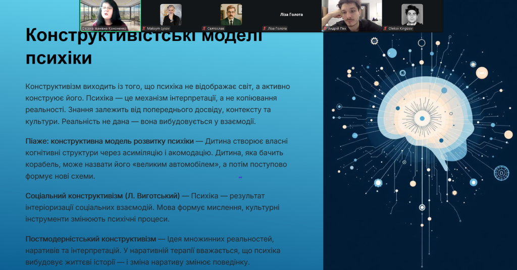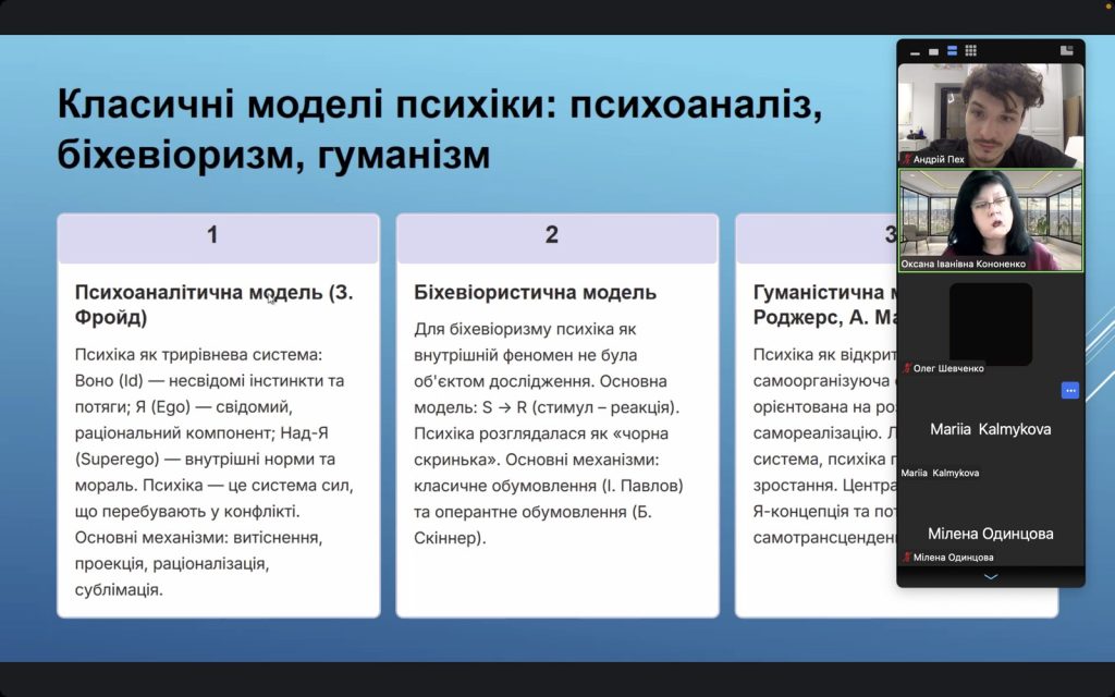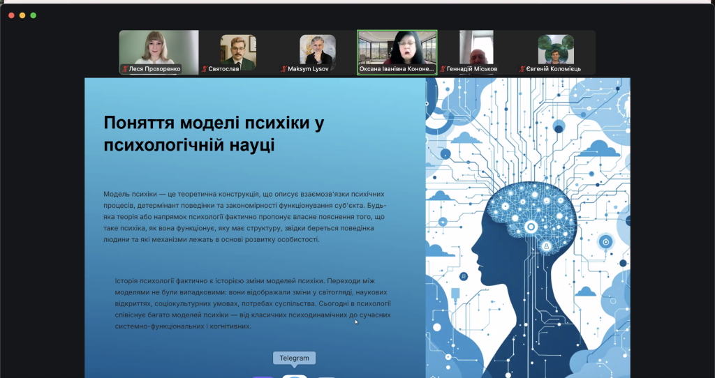Під час зустрічі було розкрито ключові концепції, пов’язані з моделями психіки у сучасній психологічній науці, зокрема: різні теоретичні підходи до структури психіки; відмінності між класичними, когнітивними та нейропсихологічними моделями; можливості їх застосування у дослідженнях та у практиці психолога й корекційного педагога; значення моделей психіки для розуміння розвитку, навчання та підтримки дітей з особливими потребами.