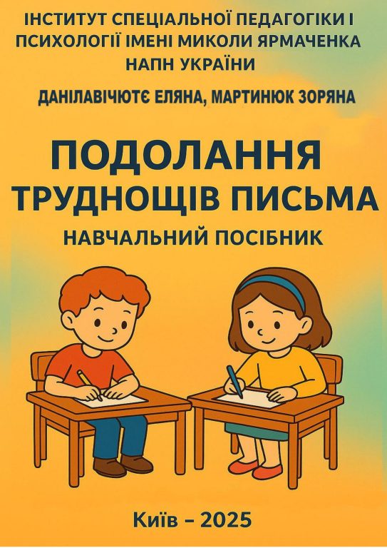 Данілавічютє Е. А, Мартинюк З. С. Подолання труднощів письма: навчальний посібник. – Київ: Інститут спеціальної педагогіки і психології імені Миколи Ярмаченка НАПН України, 2025. – 120 с.