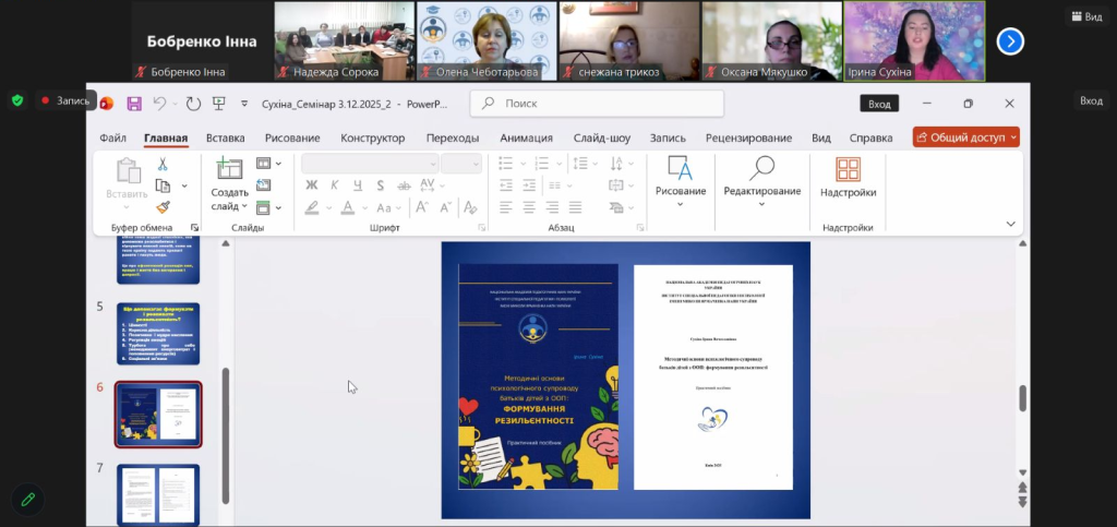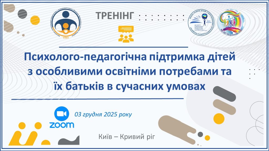 Відповідно до плану заходів Інституту спеціальної педагогіки і психології імені Миколи Ярмаченка НАПН України, затвердженому НАПН України, 3 грудня 2025 року в онлайн-форматі відбувся тренінг на тему «Психолого-педагогічна підтримка дітей з ООП та їхніх батьків в сучасних умовах».