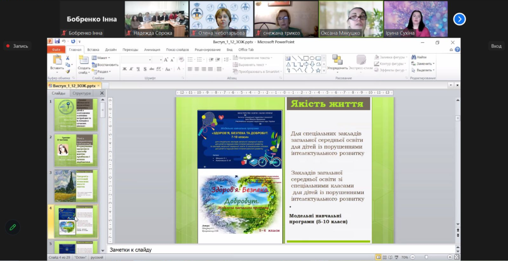 Оксана Мякушко, канд. психол. наук, ст. наук. співроб., старший науковий співробітник відділу освіти дітей з порушеннями інтелектуального розвитку Інституту, представила практичний посібник «Методичні основи корекційного навчання учнів з порушеннями інтелектуального розвитку: здоров’я, безпека та добробут». Спікер акцентувала увагу на особливостях формування здорового способу життя в учнів з інтелектуальними порушеннями, запропонувала методичні поради та вправи щодо поліпшення психоемоційного стану дітей з ООП.