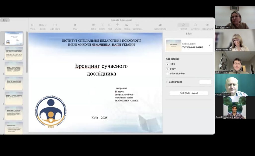 У межах дисциплін «Основи інклюзивної освіти» та «Брендинг сучасного дослідника» аспірантка ІІІ курсу спеціальності 016 «Спеціальна освіта» Ольга Волошина прочитала лекції «Оцінювання розвитку та визначення особливих освітніх потреб дитини» та «Соціальні мережі для науковців», а також провела семінарське й практичне заняття на теми: «Виявлення освітніх труднощів та інших чинників, що впливають на якість освітнього процесу»; «Пошук наукових джерел з проблеми дослідження в академічних соціальних мережах».