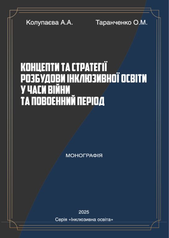 Концепти та стратегії розбудови інклюзивної освіти у часи війни та повоєнний період : монографія / Колупаєва А. А., Таранченко О. М. ; – Київ, 2025. – 450 с.; іл. – (Серія «Інклюзивна освіта»).