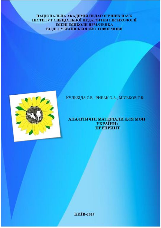 Кульбіда С. В., Рибак О. А., Міськов Г. В. (2025). Аналітичні матеріали для МОН України: препринт. Відділ української жестової мови Інституту спеціальної педагогіки і психології імені Миколи Ярмаченка НАПН України. Київ, 2025. 50 с. https://doi.org/10.33189/articles25001