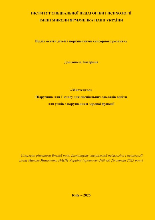 Довгопола К. С. (2025) Мистецтво. Підручник для 1 класу для спеціальних закладів освіти для учнів з порушенням зорової функції [Електронне видання]. Київ: ІСПП імені Миколи Ярмаченка НАПН України, 2025. 69 с.