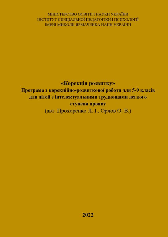 Прохоренко Л.І., Орлов О.В. Програма з корекційно-розвиткової роботи «Корекція розвитку» для 5-9 класів для дітей з інтелектуальними труднощами легкого ступеня прояву. Київ: Інститут спеціальної педагогіки і психології імені Миколи Ярмаченка НАПН України, 2022. 42 с.