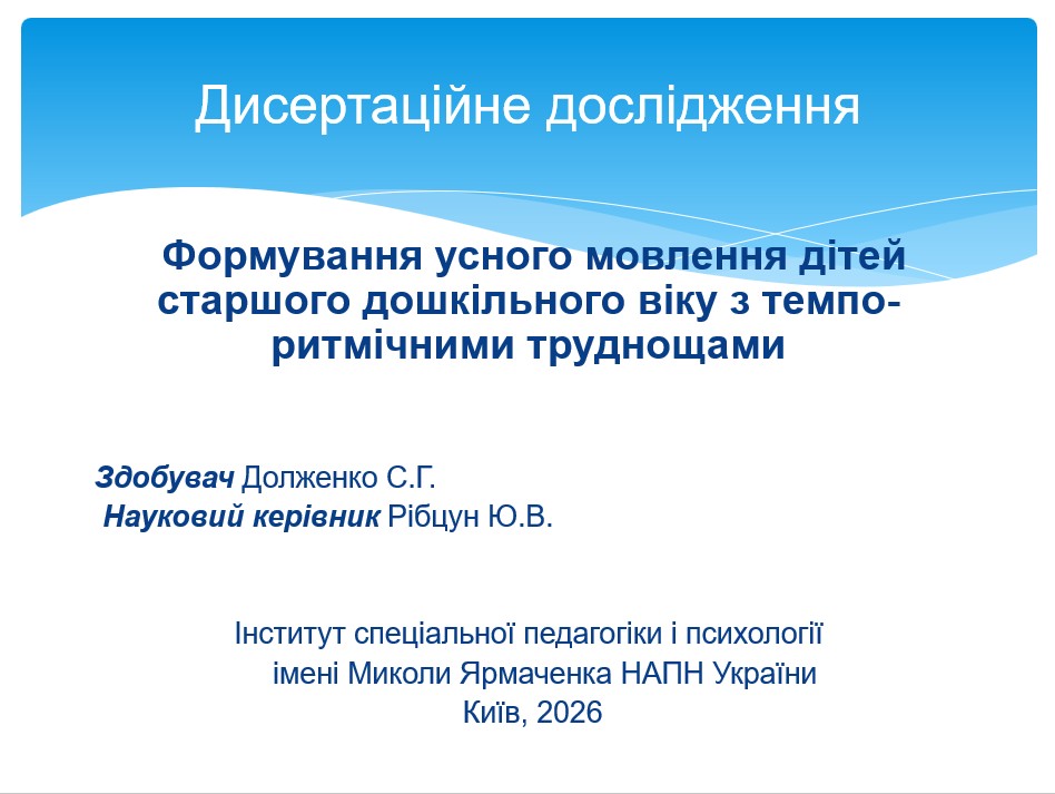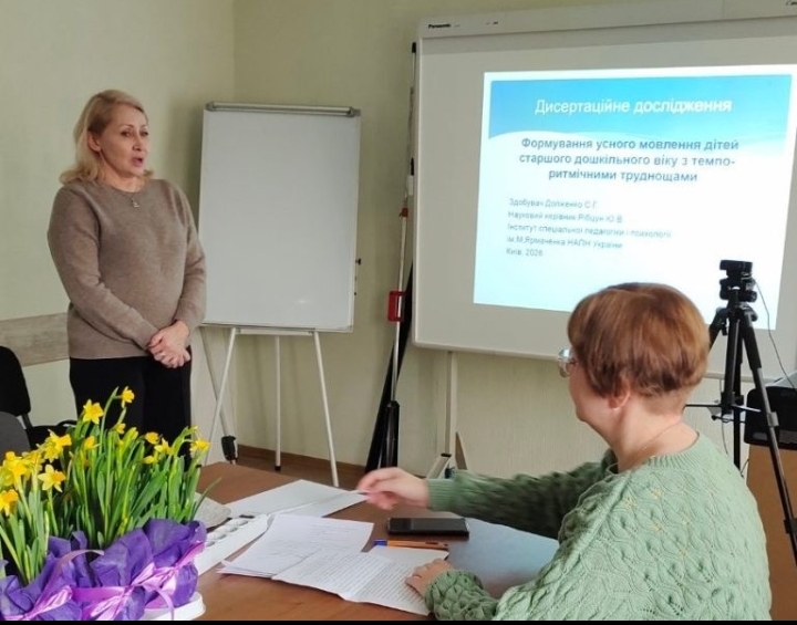 2 березня 2026 року у відділі логопедії Інституту спеціальної педагогіки і психології імені Миколи Ярмаченка НАПН України у режимі офлайн під головуванням Людмили Трофименко, канд. пед. наук, ст. наук. співроб., старшого наукового співробітника відділу логопедії, відбувся фаховий семінар, присвячений обговоренню дисертаційного дослідження аспірантки четвертого року навчання Світлани Долженко на тему: «Формування усного мовлення дітей старшого дошкільного віку з темпо-ритмічними труднощами», поданого на здобуття ступеня доктора філософії зі спеціальності 016 «Спеціальна освіта» щодо його рекомендації для розгляду та захисту у разовій спеціалізованій вченій раді.
