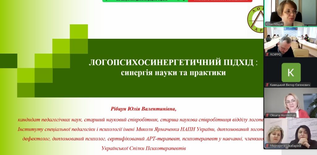 На пленарному засіданні з доповіддю «Логопсихосинергетичний підхід: синергія науки та практики» виступила Юлія Рібцун, канд. пед. наук, ст. наук. співроб., старший науковий співробітник відділу логопедії Інституту.
