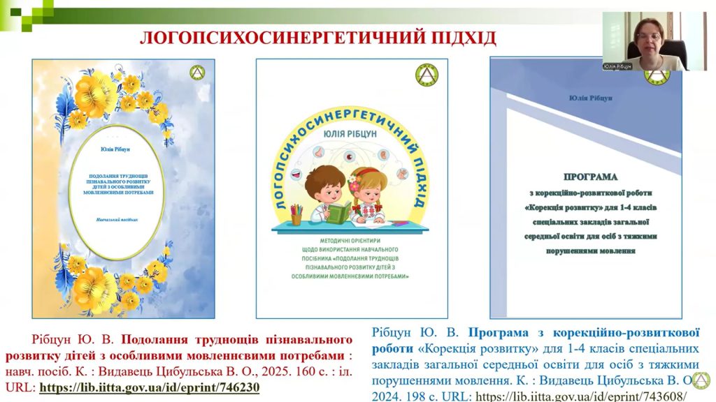 У доповіді було розкрито зміст авторського логопсихосинергетичного підходу (Рібцун, 2021), згідно з яким упродовж 2024-2025 років був розроблений навчальний комплект, який складається з програми «Корекція розвитку» для 1-4 класів спеціальних закладів загальної середньої освіти для осіб з тяжкими порушеннями мовлення, навчального посібника «Подолання труднощів пізнавального розвитку дітей з особливими мовленнєвими потребами» та методичного посібника «Методичні орієнтири щодо використання навчального посібника «Подолання труднощів пізнавального розвитку дітей з особливими мовленнєвими потребами».