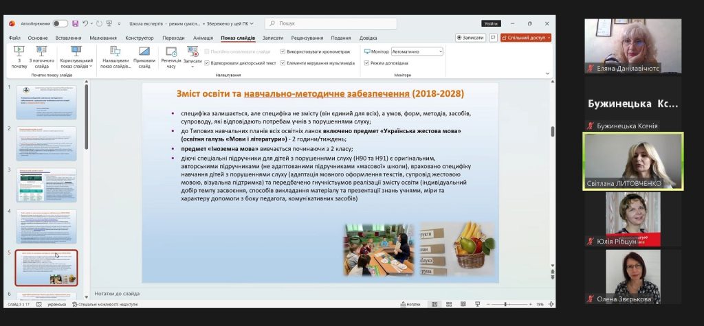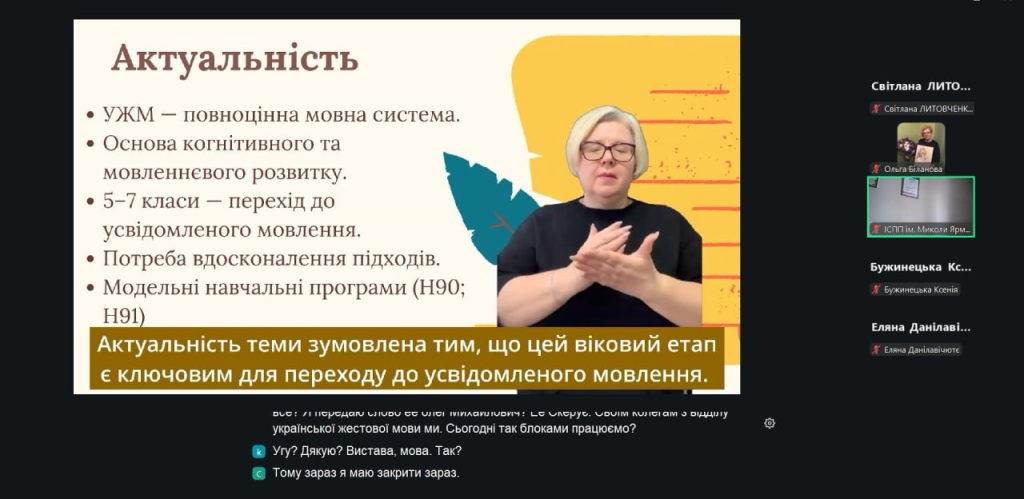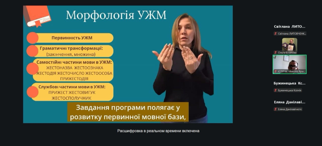 – Ольга Біланова, науковий співробітник відділу української жестової мови Інституту, Лаура Іващенко, науковий співробітник відділу української жестової мови Інституту – «Досвід викладання української жестової мови у 5-7 класах спеціальних закладів освіти»;