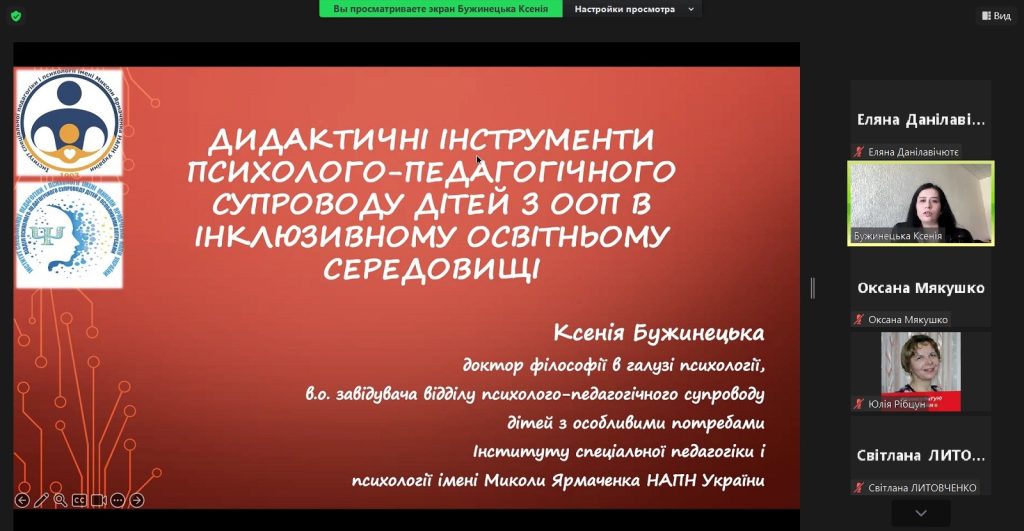 – Ксенія Бужинецька, докт. філософії, в.о. завідувача відділу психолого-педагогічного супроводу дітей з особливими потребами Інституту – «Дидактичні інструменти психолого-педагогічного супроводу дітей з ООП в інклюзивному освітньому середовищі»;