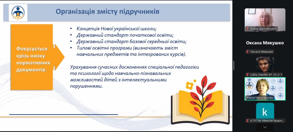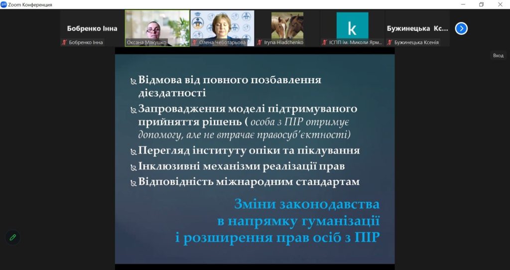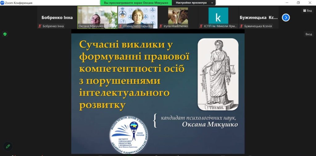– Оксана Мякушко, канд. психол. наук, ст. наук. співроб., старший науковий співробітник відділу освіти дітей з порушеннями інтелектуального розвитку – «Сучасні виклики у формуванні правової компетентності осіб з порушеннями інтелектуального розвитку»;