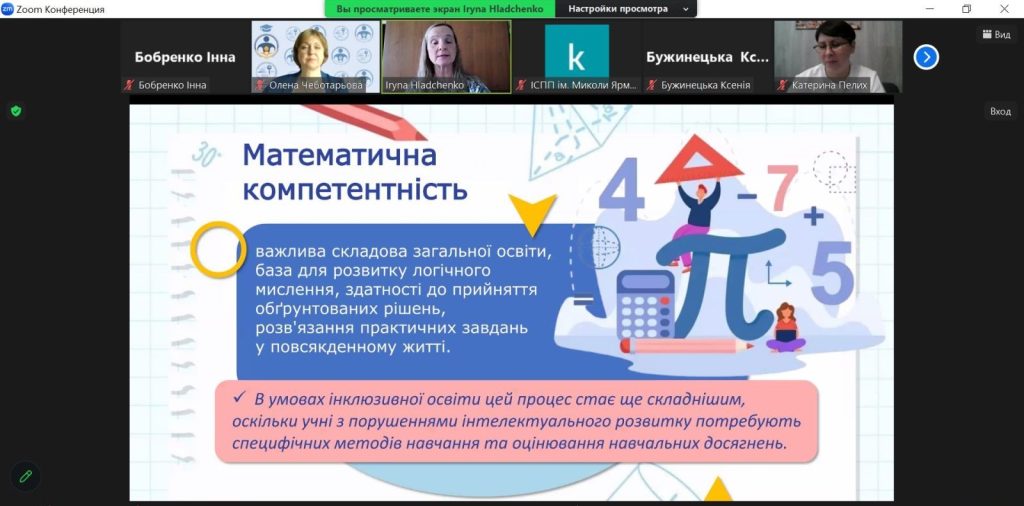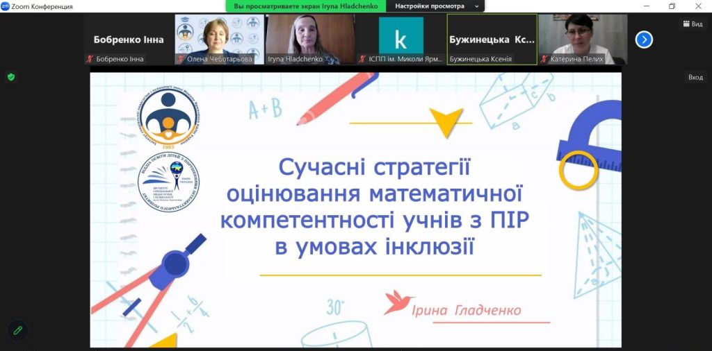– Ірина Гладченко, канд. пед. наук, ст. наук. співроб., старший науковий співробітник відділу освіти дітей з порушеннями інтелектуального розвитку – «Сучасні стратегії оцінювання математичної компетентності учнів з ПІР в умовах інклюзії»;