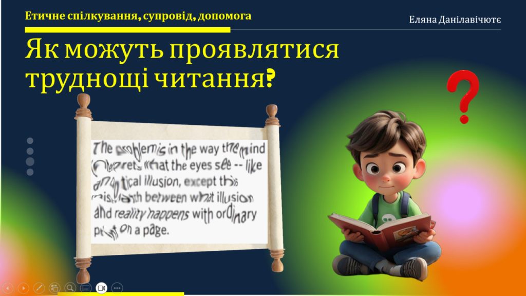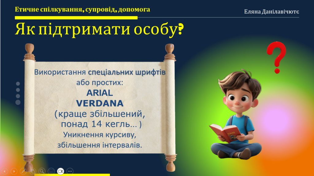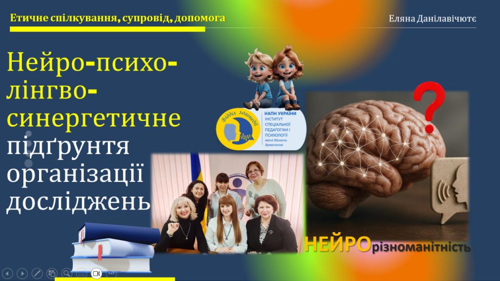 Еляна Данілавічютє ознайомила слухачів курсу з підходами до організації досліджень у галузі логопедії, результатами наукового пошуку вчених відділу, серед яких вагоме місце належить шляхам організації лінгвістично-комфортного середовища для осіб з дефіцитом функції мовлення різного походження. У процесі виступу було представлено особливості сприймання інформації на слух, варіанти продукування власного висловлення означеною категорією осіб, можливості розпізнавання такого мовлення оточуючими, своєрідність емоційно-вольової сфери і її вплив на функціонування і життєдіяльність в умовах лінгвістичних обмежень; виокремлено труднощі й бар’єри, що виникають у процесі усної і писемної комунікації осіб з особливими мовленнєвими потребами; розкрито сутність етичного спілкування, особливості супроводу і надання допомоги з метою створення відкритого й доступного простору для відвідувачів музею.