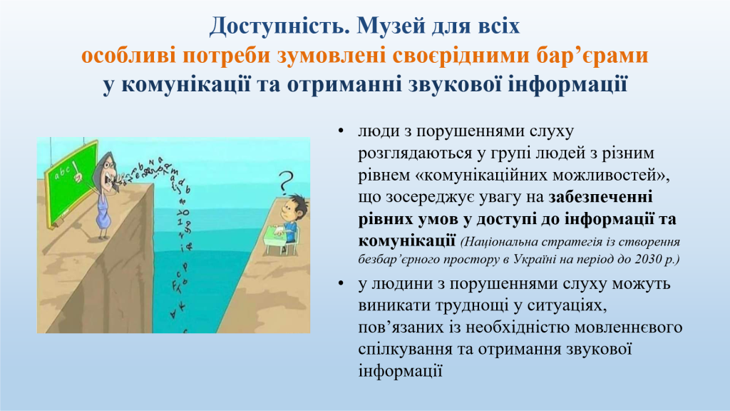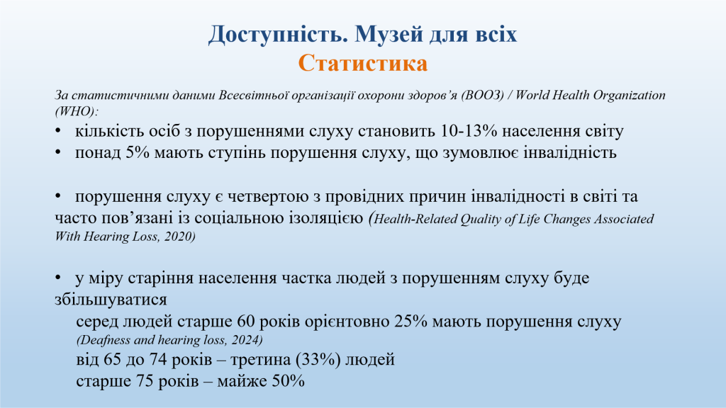У виступі Світлани Литовченко було представлено роль слуху у розвитку дитини, особливості сприймання та розвитку мовлення при різних ступенях порушення слуху, можливості сучасних технічних засобів слухопротезування та допоміжних засобів звукопідсилення (оптимізації співвідношення сигнал/шум). Зазначено, що порушення слуху може виникати внаслідок поранень та травм (контузій) серед військових та цивільних під час війни та є найпоширенішою причиною інвалідності серед ветеранів. Було наголошено на коректній термінології, розкрито сутність соціокультурного підходу до визначення потреб людини, а також репрезентовано варіативність вибору мови спілкування (словесна та жестова), шляхи адаптації середовища для сприймання звукової та візуальної інформації, надано рекомендації до оформлення матеріалів. Серед рекомендованих засобів доступності було розглянуто специфіку використання субтитрів, підписів, методів «легкого читання», «створення візуальних протоколів», альтернативні формати замість традиційних з великою кількістю аудіо матеріалів. Серед корисних ресурсів доповідач запропонувала гайд та чек-лист для організації доступних заходів, навчально-методичні посібники стосовно адаптації дітей з порушеннями слуху різного віку, приклади облаштування безбар’єрного простору в музеях інших країн.