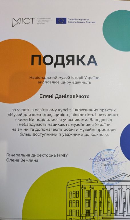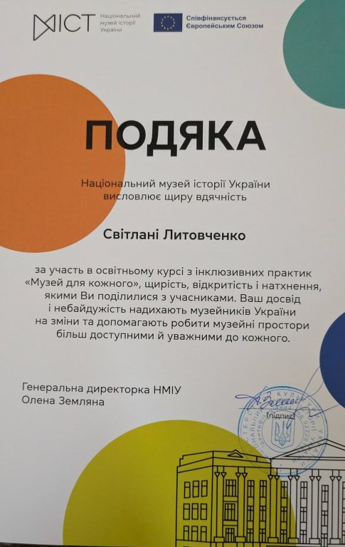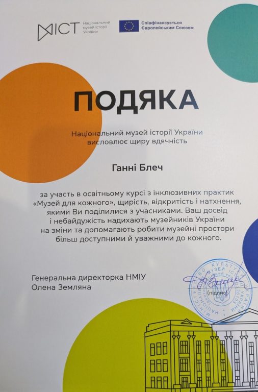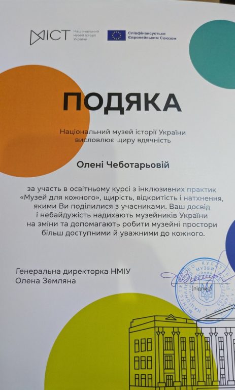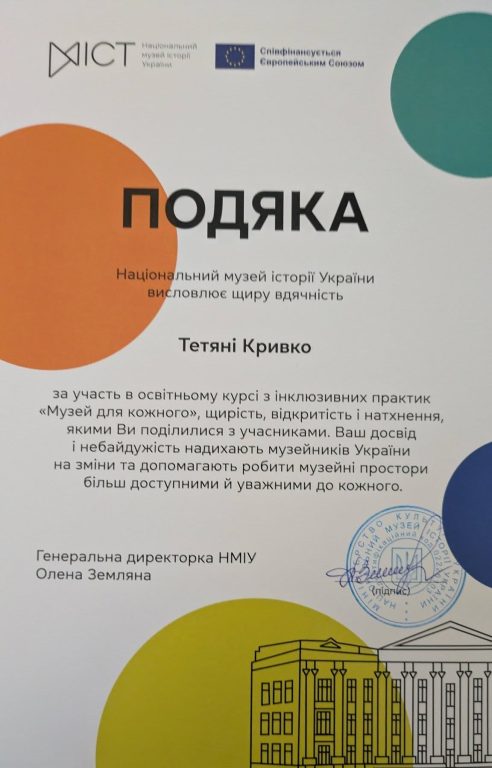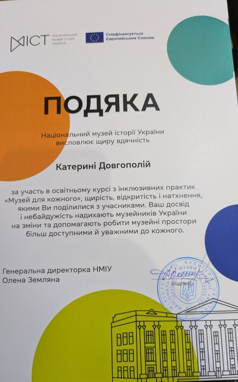 24 квітня 2026 року завершено освітній курс з інклюзивних практик «Музей для кожного», організований Національним музеєм історії України та Представництвом Європейського Союзу в Україні – «Разом небайдужі: Музей для кожного» під егідою Міністерства культури України.
